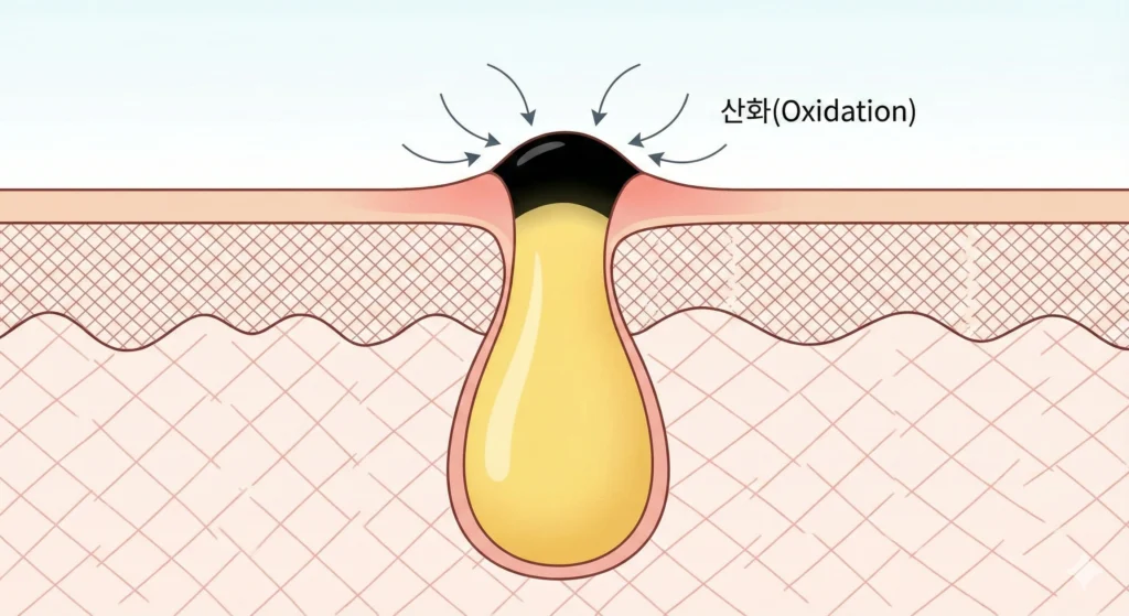 - 블랙헤드의 형성 원리: 각질이나 노폐물이 모공 입구를 막으면, 배출되지 못한 피지가 덩어리로 뭉치게 됩니다. 이 피지 덩어리의 끝부분이 공기와 접촉하여 ‘산화’되면 검게 변하는데, 이것이 바로 우리가 고민하는 블랙헤드입니다.